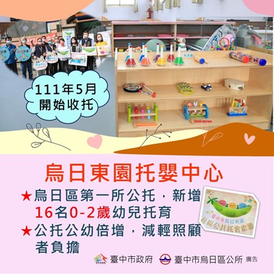 烏日東園托嬰中心 東園公共托育家園是烏日區第一所公托,於111年5月開辦,共計收托16名幼兒,規劃活動區、睡眠區、盥洗室、清潔區,採開放空間設計,提供各類型學習情境,營造舒適、衛生安全與符合幼兒發展的最佳照顧環境。