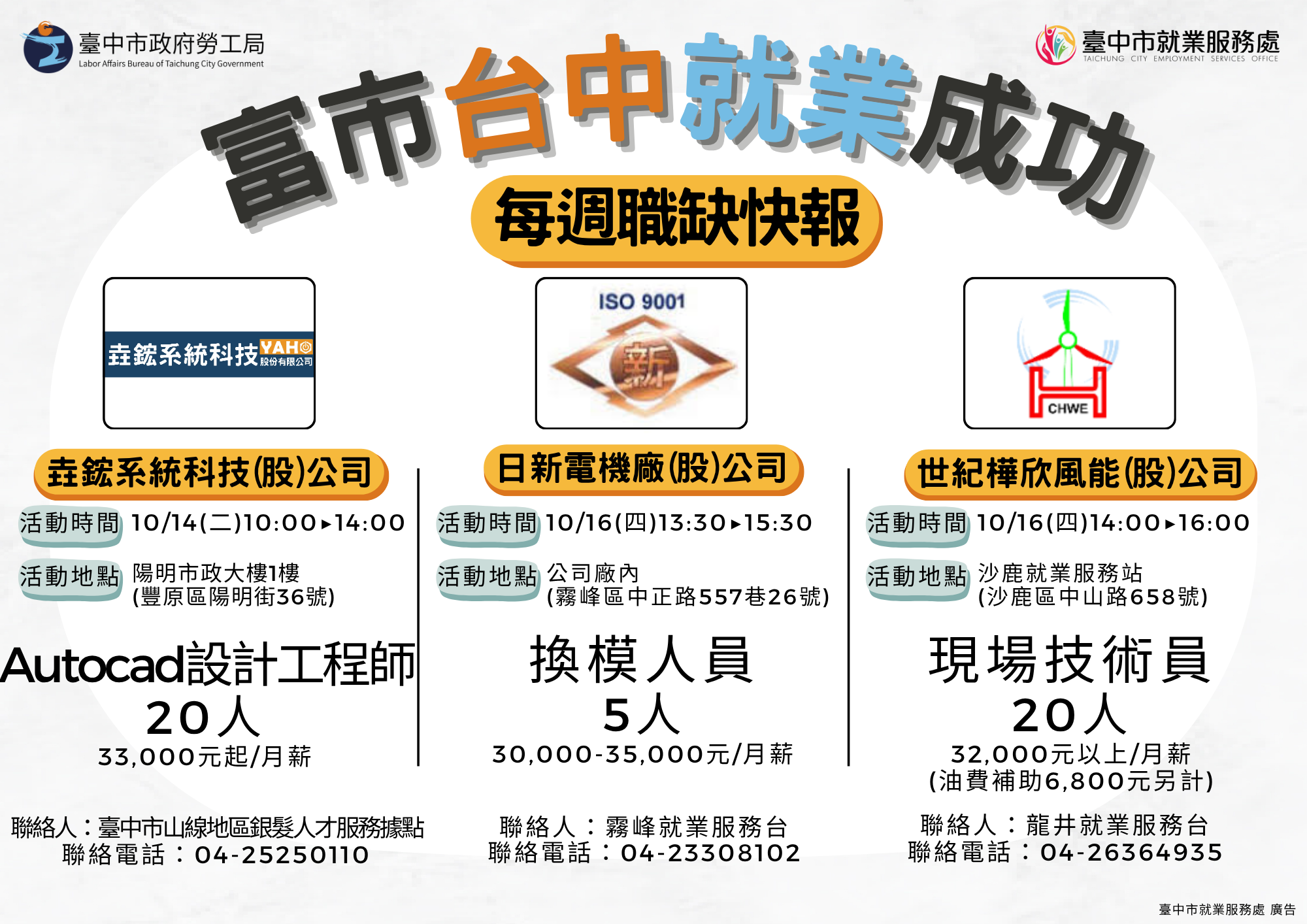 387240200J_1140057164_ATTACH1 臺中市政府職缺快 報來囉!10/13-10/17邀請垚鋐系統科技、日新電機廠、世紀樺欣等廠商,辦理10場徵才,提供998個職缺,查詢更多職缺資訊,請洽04-22289111轉36100洽詢。