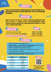 本(114)年10月20日上午10時開放線上報名,相關活動訊息可至本所臉書粉絲專頁(https://www.facebook.com/tcnorth.gov)參閱。