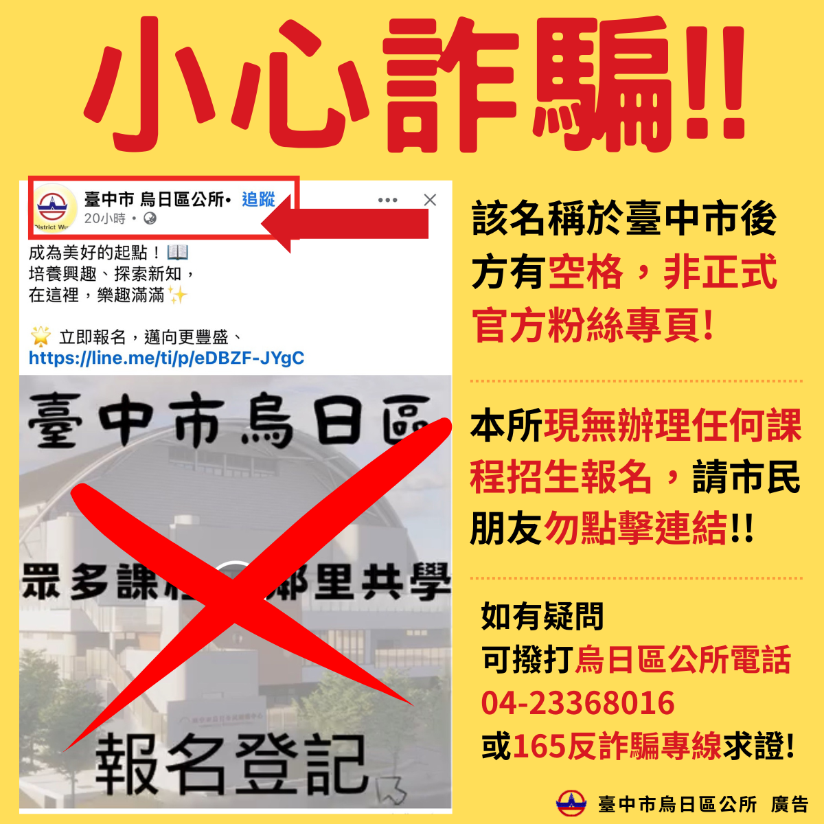 林區長說明,如有任何疑問,請撥打烏日區公所電話04-23368016或165反詐騙專線,小心查證!