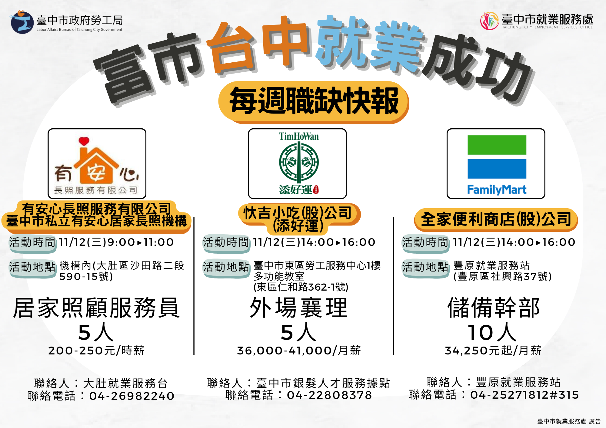 387240200J_1140063294_ATTACH1 臺中市政府職缺快 報來囉!11/11-11/14邀請有安心長照、添好運、全家等廠商,辦理10場徵才,提供303個職缺,請洽04-22289111轉36100洽詢。