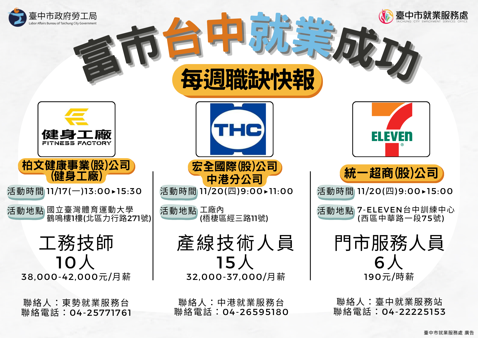 臺中市政府職缺快 報來囉!11/17-11/20邀請健身工廠、宏全國際、統一超商等廠商,辦理6場徵才,提供235個職缺,查詢更多職缺資訊,請洽04-22289111轉36100洽詢。