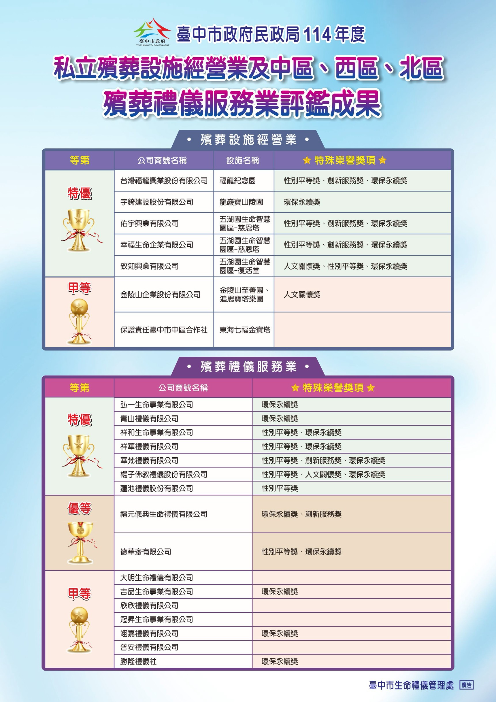 一、依據臺中市殯葬設施及殯葬服務業查核評鑑及獎勵辦法暨114年度私立殯葬設施及殯葬服務業查核評鑑實施計畫辦理。二、本案評鑑成果網站連結臺中市生命禮儀管理處殯葬資訊服務網網頁<評鑑優良名單>(網址:https://gov.tw/hEy)。