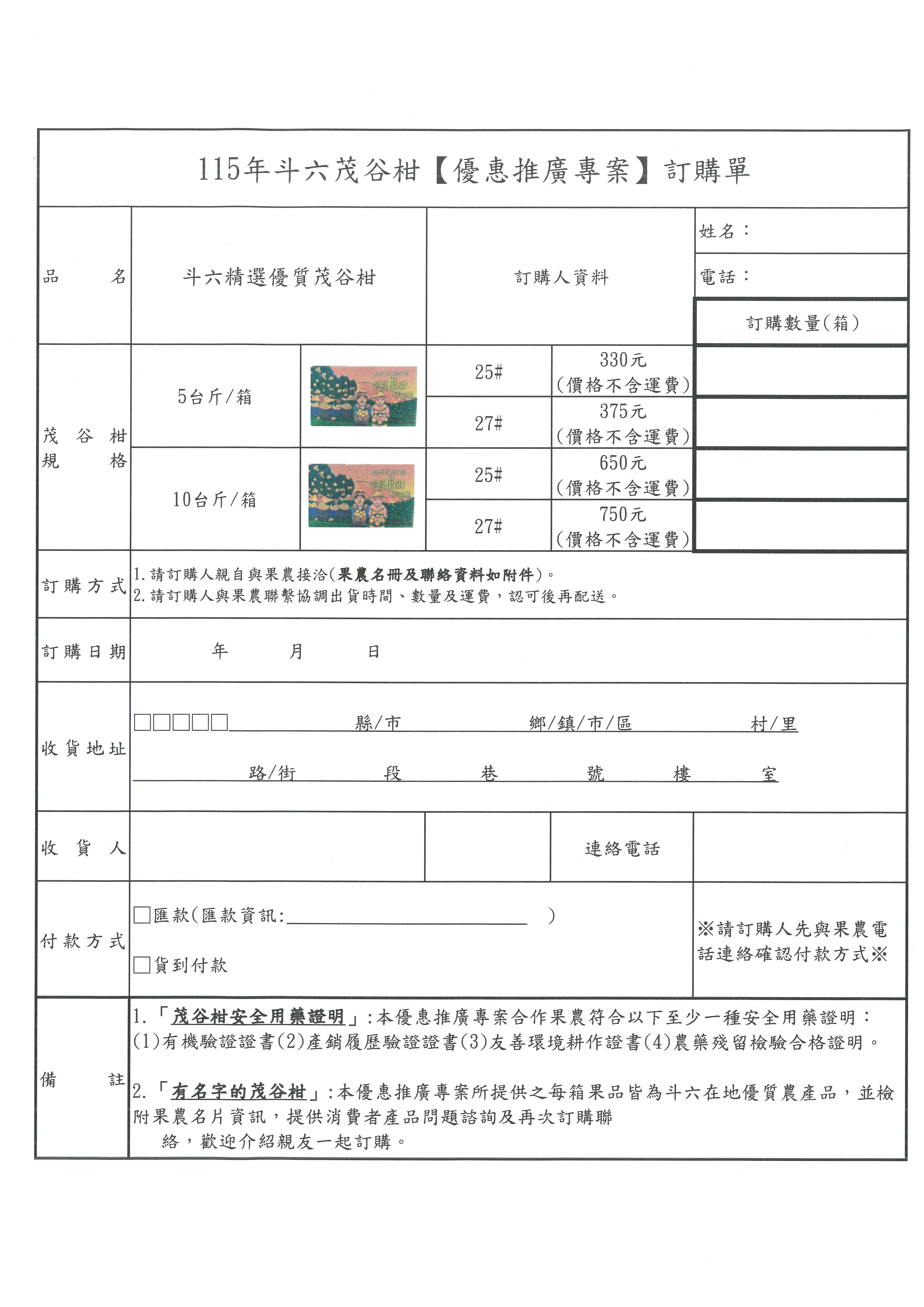「115年斗六茂谷柑」優惠推廣專案訂購資料1份,惠請踴躍訂購。