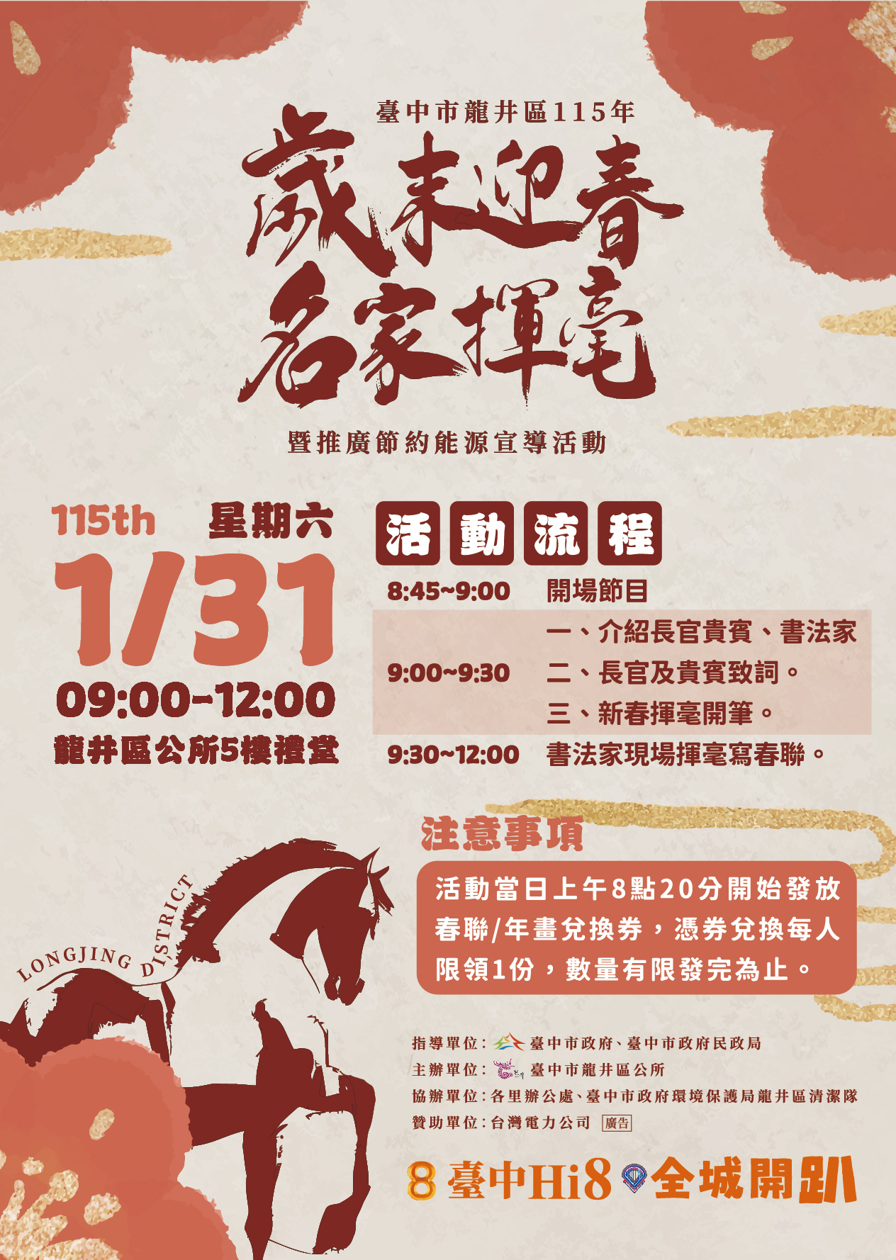 二、活動內容:為迎接115年馬年春節,本所特邀請造詣深厚書法家現場揮毫書寫春聯,供民眾免費索取。