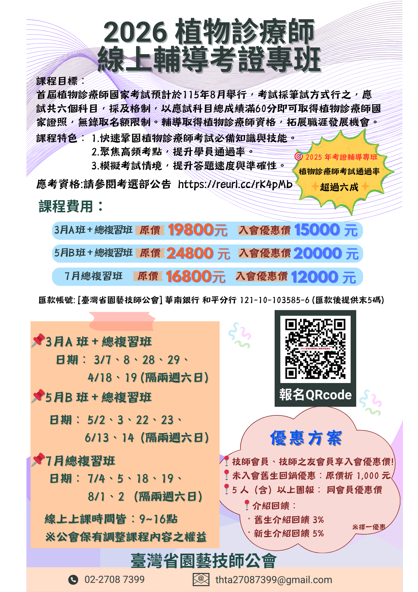 臺灣省園藝技師公會「115年植物診療師線上輔導考證專班」報名簡章
