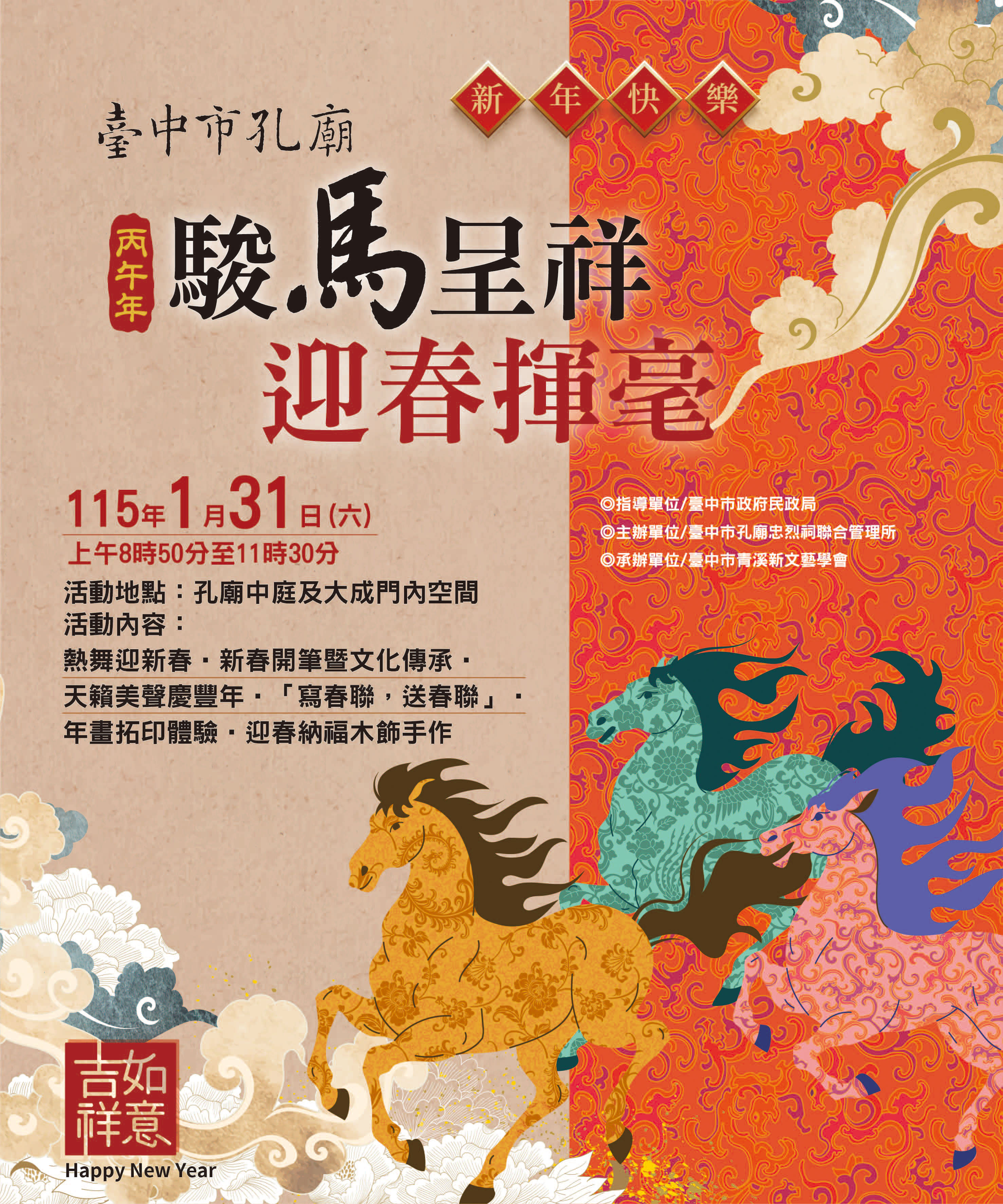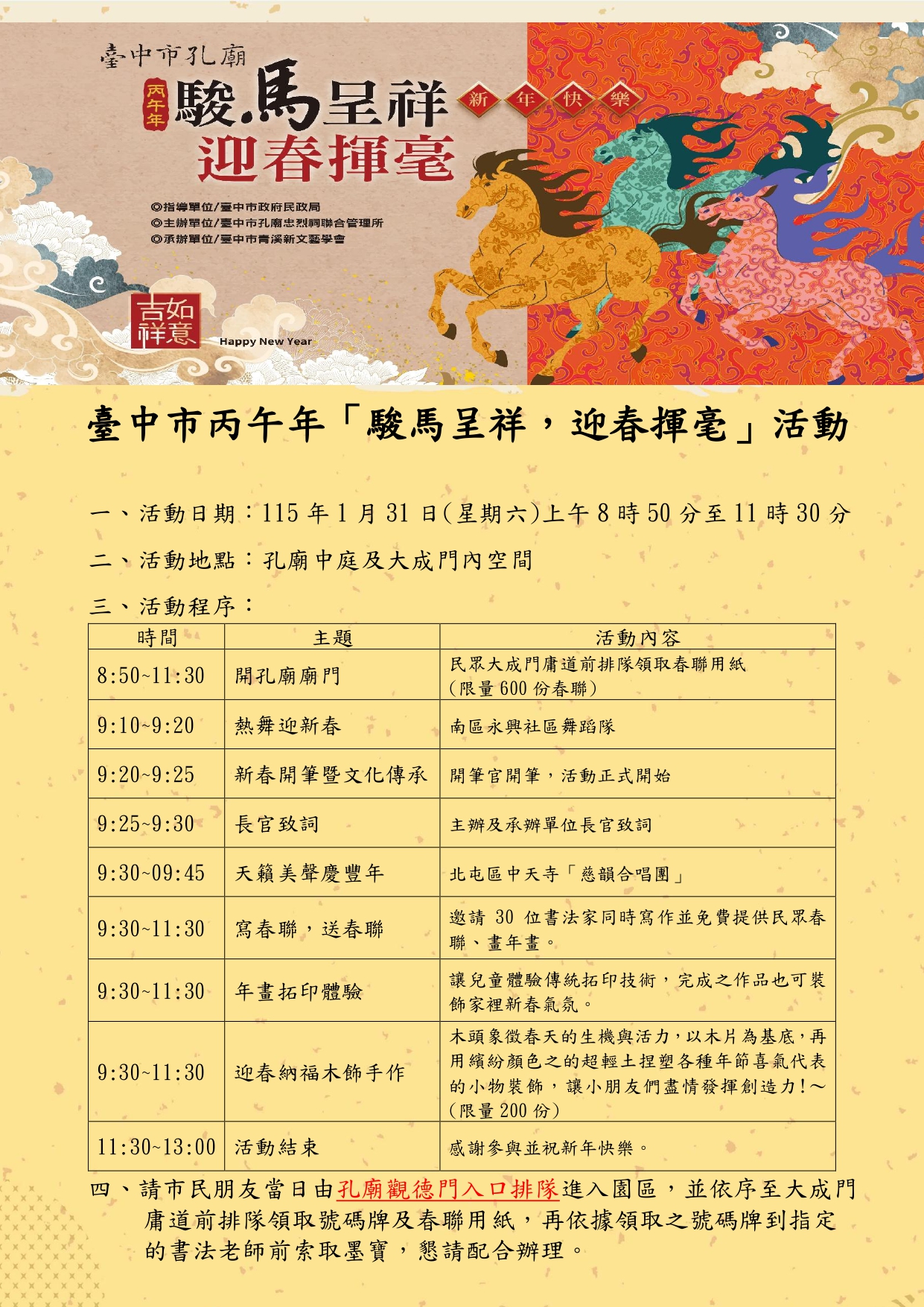 二、 活動當日市民朋友可由孔廟觀德門入口排隊進入園區領取春聯用紙,並於開場表演後由30位書法名家現場揮毫,為民眾提供免費寫春聯畫年畫(限量600份),另規劃兒童年畫拓印體驗區及迎春納福木飾手作(限量200個)區,讓小朋友親自動手拓印年畫及製作年節吊飾,體驗動手玩創意的樂趣,所得春聯及完成之作品皆可於農曆年節前夕布置家中新春氛圍。