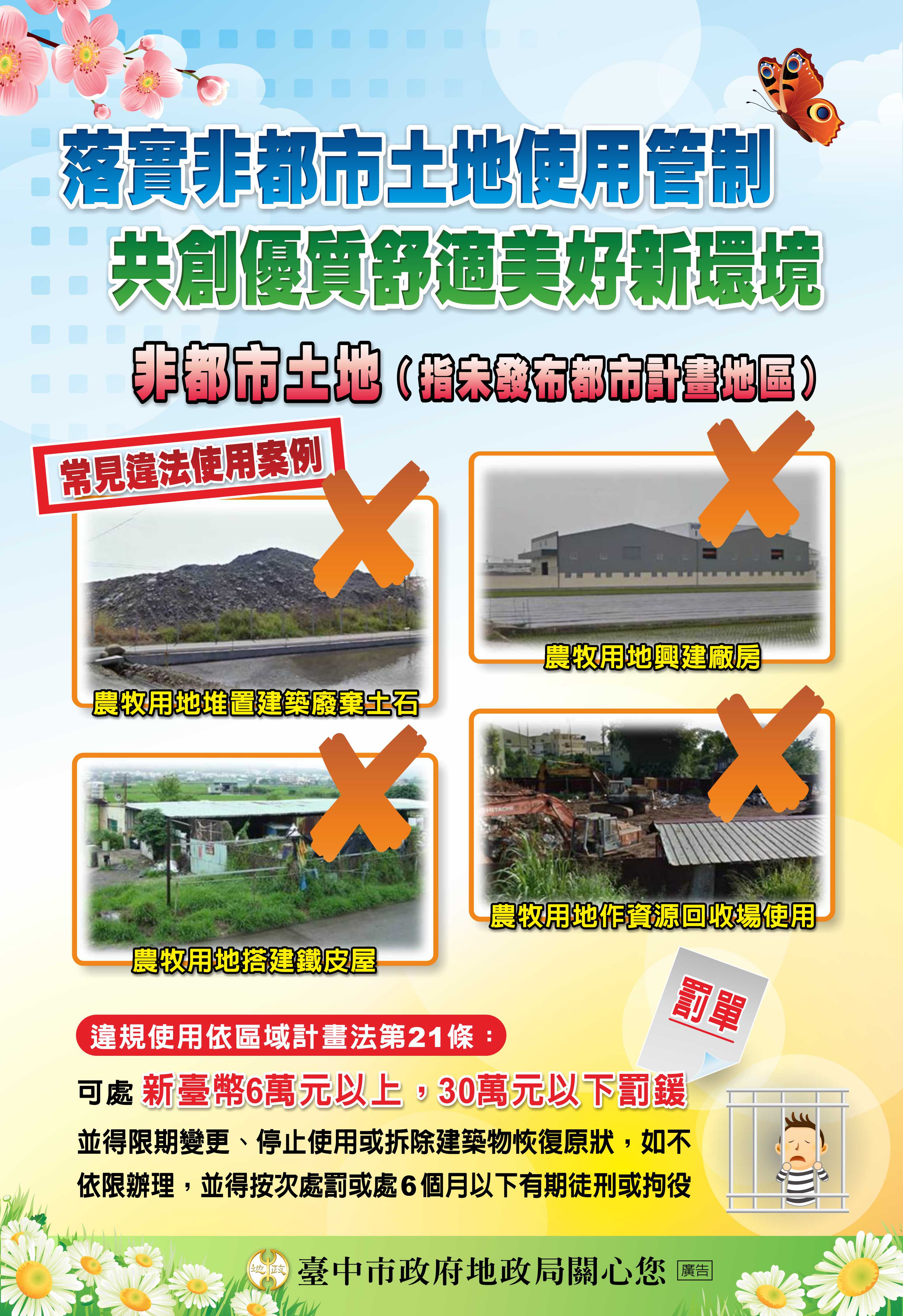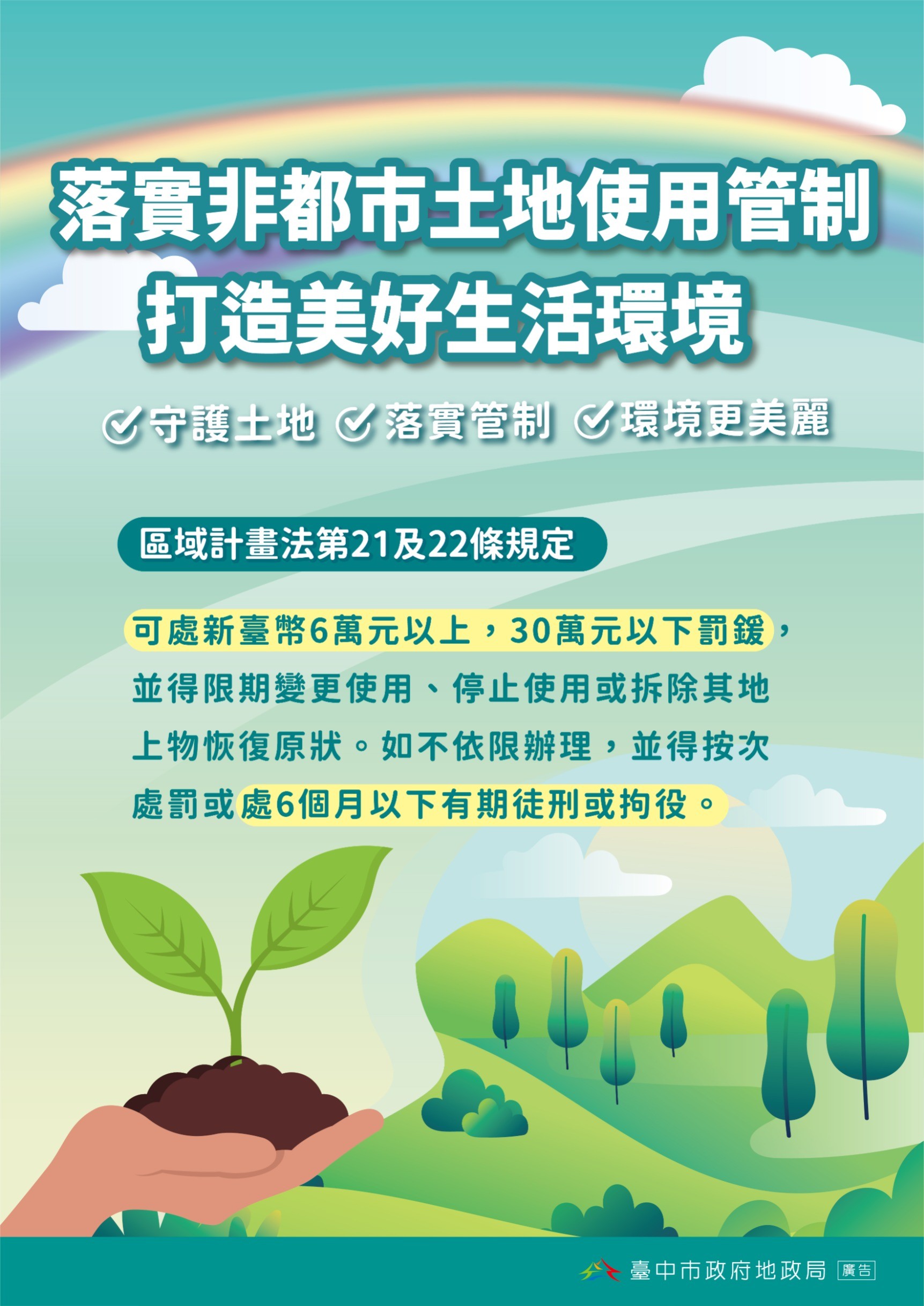 宣導落實非都市土地使用管制,共創優質舒適美好新環境。有關違反土地使用可依區域計畫法第21條:可處新臺幣六萬元以上三十萬元以下罰鍰,並得限期變更使用、停止使用或拆除地上物恢復原狀而不遵從者,得按次處罰或處6個月以下有期徒刑或拘役。.jpg