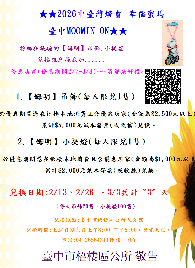 一、2026中臺灣燈會即將於215日至33日假中央公園辦理,民政燈區海線梧棲鴨母寮永天宮燈組即將氣勢磅礴、隆重登場!透過中臺灣燈會之辦理,將本區媽祖中心信仰融入燈組,依據市府民政局定調為祈福區-慶典嘉年華之祈福意象,佐以宗教特色佈展,本區與屬於在地獨有的藝術人文特色互相結合,將吸引全臺各地的好朋友來臺中輕旅行、購物消費以促進在地經濟發展,打造海線新亮點,展現臺中梧棲為「富市臺中,活力梧棲」幸福進行市之形象,本所擬建立平台,讓藝文氣息走入民眾生活,提昇區內藝文水平,並促進文化活動的均衡發展,進一步發展觀光產業吸引外地人潮,創造各項商機,是以辦理旨揭活動。