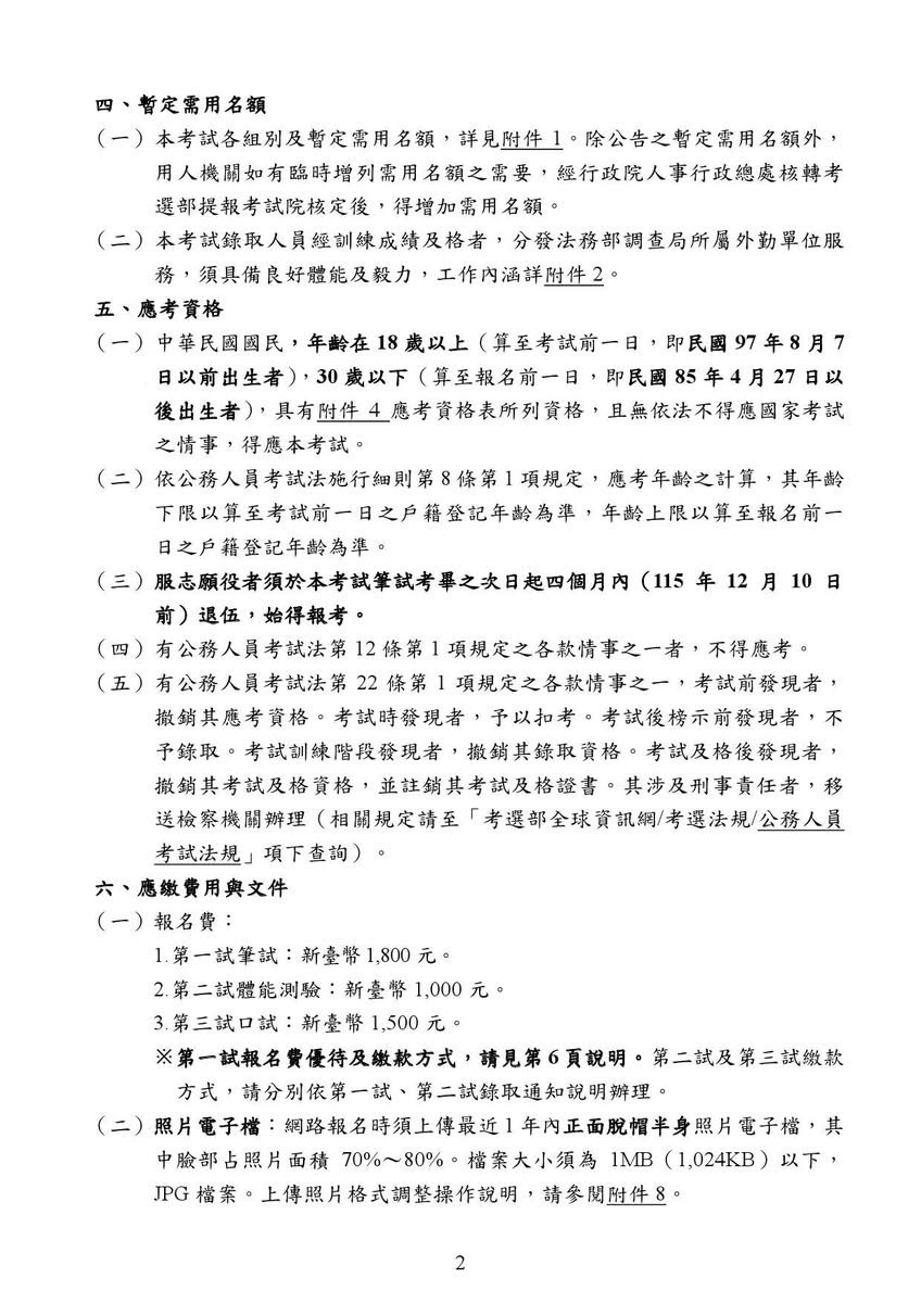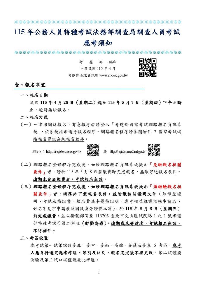 115年法務部調查局調查人員特考(三等考試)📅報名日期:115年4月28日至5月7日📅考試日期:115年8月8日至8月10日 各項考試資訊請參考考選部(https://www.moex.gov.tw)或法務部調查局(https://www.mjib.gov.tw)網站特考資訊專區。